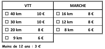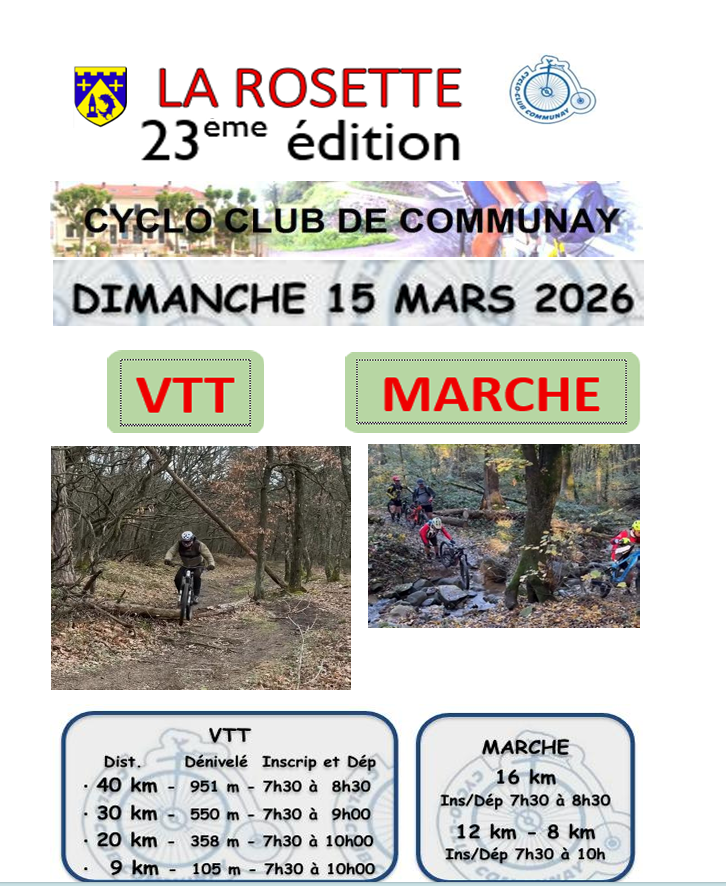 RANDONNEE DE LA ROSETTE - 15 MARS 2026La 23ème Randonnée de la Rosette aura lieu le dimanche 15 mars 2026 de 7h30 à 13h00. - Randonnée ouverte à tous. - Aucun chronométrage n'est réalisé. - Vélos à Assistance Electrique acceptés. - Réglement de la randonnée en fin de page. ![]() Au programme - 4 parcours VTT : 40 km - OPENRUNNER N° 20386207 30 km - OPENRUNNER N° 20386231 20 km - OPENRUNNER N° 20386244 9 km - OPENRUNNER N° 20315706 - 3 parcours MARCHE : 16 km - OPENRUNNER N° 20315606 12 km - OPENRUNNER N° 20315642 8 km - OPENRUNNER N° 20366910 Prestations : - Ravitaillement sur tous les circuits, (sauf 9km VTT et 8km MARCHE), - Tombola gratuite.et à l'arrivée, (pour tous). - Aire de lavage. Récompenses : Récompenses pour les randonneurs VTT : - Participante la plus expérimentée. - Participant le plus expérimenté. - Participante la plus jeune. - Participant le plus jeune. - Club le plus nombreux, (3 adhérents minimum). - Club le plus éloigné, (3 adhérents minimum), Inscriptions et départs : - Inscriptions et départs au Gymnase de la Plaine, route de Marennes, - Inscriptions et départs de 7h30 à 8h30 pour le VTT 40 km età Communay, (à coté du stade). la MARCHE 16 km. - Inscriptions et départs de 7h30 à 9h00 pour le VTT 30 km et la MARCHE 12 km. - Inscriptions et départs de 7h30 à 10h00 pour les autres circuits, MARCHE et VTT - Fin de l'accueil à l'arrivé à 13h00. ![]() REGLEMENT DE LA RANDONNEE VTT ET MARCHE DE LA ROSETTE La randonnée « VTT et MARCHE de la ROSETTE » est organisée par le Cyclo Club de Communay le dimanche 15 mars 2026 de 7h30 à 13h00. Elle comporte 4 circuits VTT de 9 - 20 - 30 - 40 km et 3 circuits marche de 8 - 12 et 16 km. C'est une randonnée ouverte à tous, aucun chronométrage n'est réalisé. La participation des mineurs reste sous l'entière responsabilité des parents. Ne seront reconnus comme participants que les personnes dont le bulletin d’engagement et la cotisation seront enregistrés. Pour les participants aux circuits VTT, le port du casque rigide et d'une tenue haute visibilité est obligatoire. Prévoir du matériel individuel de réparation. Les randonneurs pédestres doivent faire preuve de la plus grande prudence lorsqu'ils traversent ou marchent le long d'une voie ouverte à la circulation. Chaque participant est tenu d'avoir une assurance individuelle responsabilité civile et accidents corporels le couvrant pour les risques encourus. La responsabilité des organisateurs ne pourra être engagée en cas d'accident ou de défaillance physique. En s'inscrivant, les participants déclarent sur l'honneur n'avoir aucune contre-indication à la pratique du cyclisme ou de la marche et acceptent le règlement. Les organisateurs déclinent toute responsabilité en cas de vol, détérioration, perte des biens personnels des participants. Pour des raisons de sécurité, les participants ne doivent pas quitter les chemins balisés par les organisateurs. Les randonnées se déroulent sur des voies et chemins ouverts à la circulation. Les participants doivent respecter strictement le code de la route et les arrêtés municipaux des localités traversées et se considérer comme étant en excursion personnelle. Les consignes des signaleurs devront être scrupuleusement respectées. Respecter la nature, les gens qui y vivent et y travaillent, les propriétés privées qui sont exceptionnellement ouvertes. Respecter tous les autres usagers des chemins. Les organisateurs se réservent le droit de modifier les parcours en fonction de l’état des chemins les jours précédant la manifestation. Les participants autorisent les organisateurs à utiliser, à des fins promotionnelles, toute photo ou vidéo sur lesquelles ils pourraient apparaître lors de la manifestation. Le présent règlement est considéré comme accepté dès l'inscription. *** |
